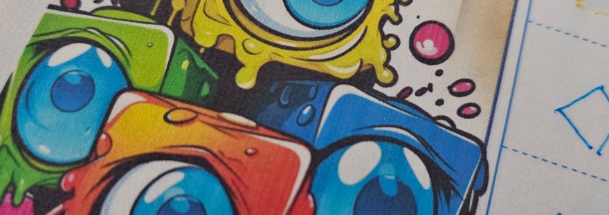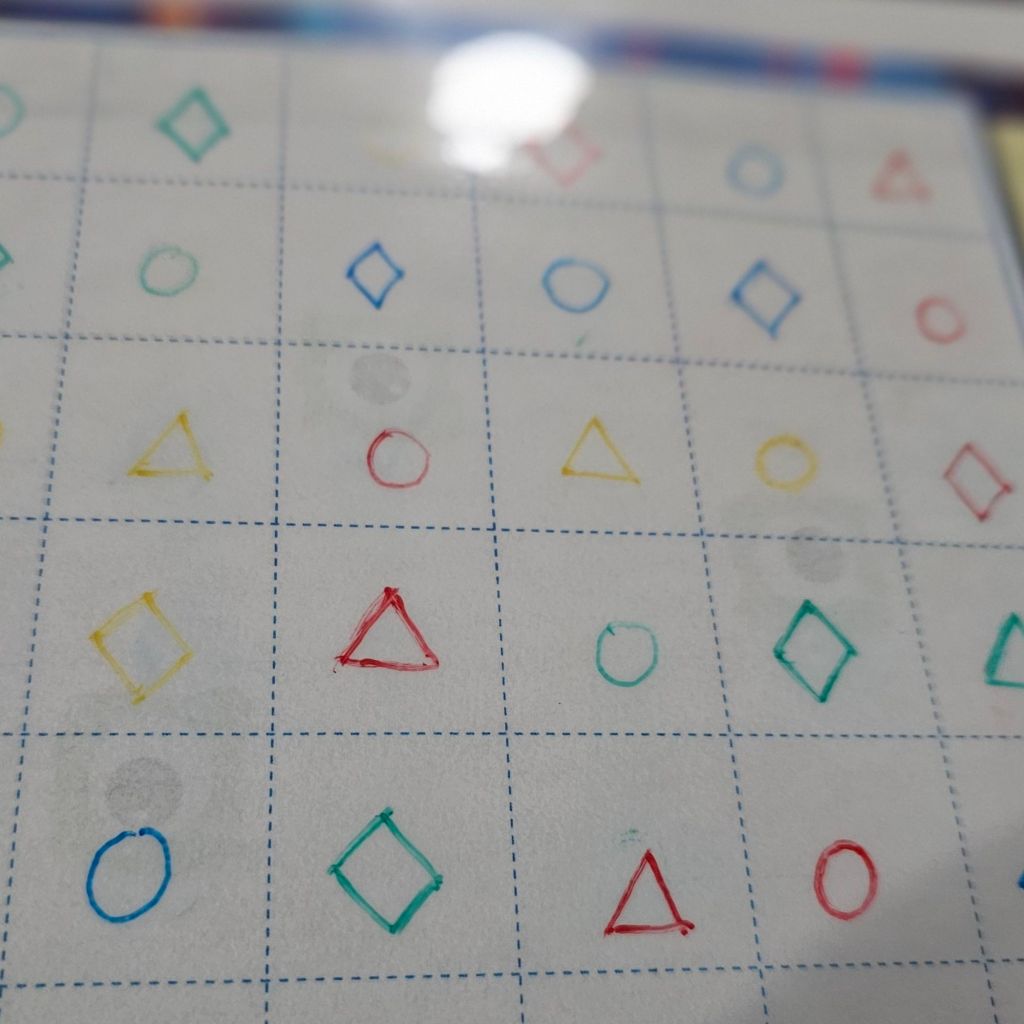 Evil Lab is actually a very simple game. Someone rolls two dice, and each player uses one to chose a shape and the other for option between two colours. The caveat is that no shape can be placed besides the same shape. At the end of the game, you get point for each shape, shapes that you have one of every color, and for sequences of shapes of the same color.