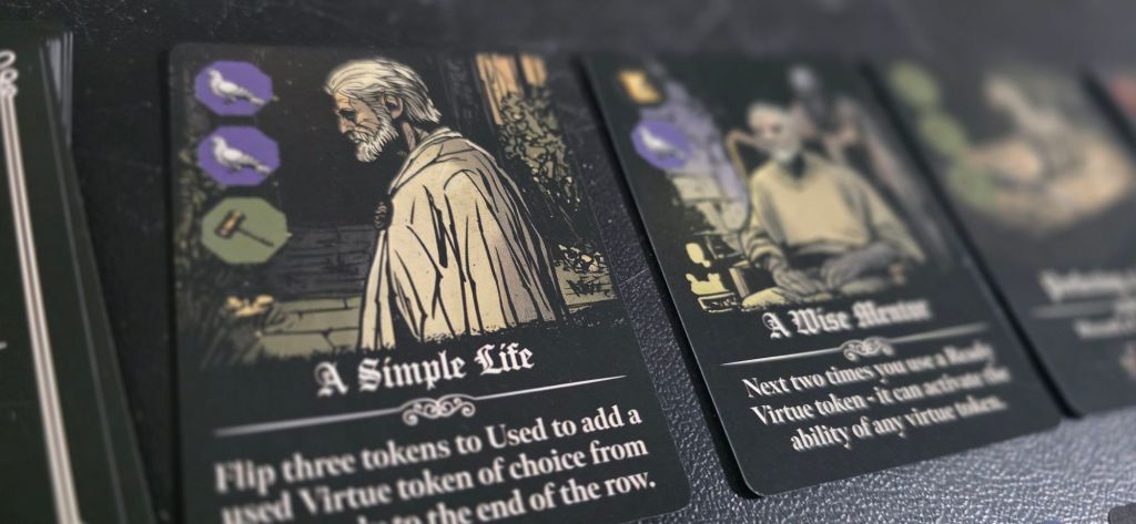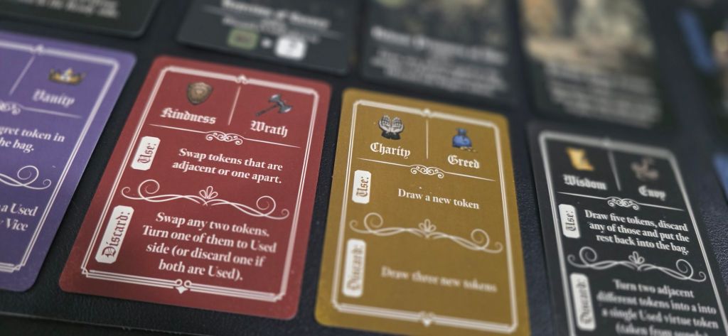 You do that by using tokens and cards to manipulate the row. Each virtue has an effect when you use it, like swapping cards and dice, discarding regrets or drawing more tokens. Each card has one unique effect you can discard it to use or they can be used to draw more tokens too.