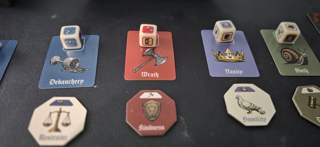 To setup, draw one vice die from the bag, without rolling it and set aside. Each dice have 3 faces of its main vice, and a combination of other 3. After that, draw two cards, picking one and discarding the other. Each card gives you a one time ability, as well adding some virtue tokens to the bag. Repeat this 4 more times, then use the cards to populate the token bag, and only the roll each die in order.