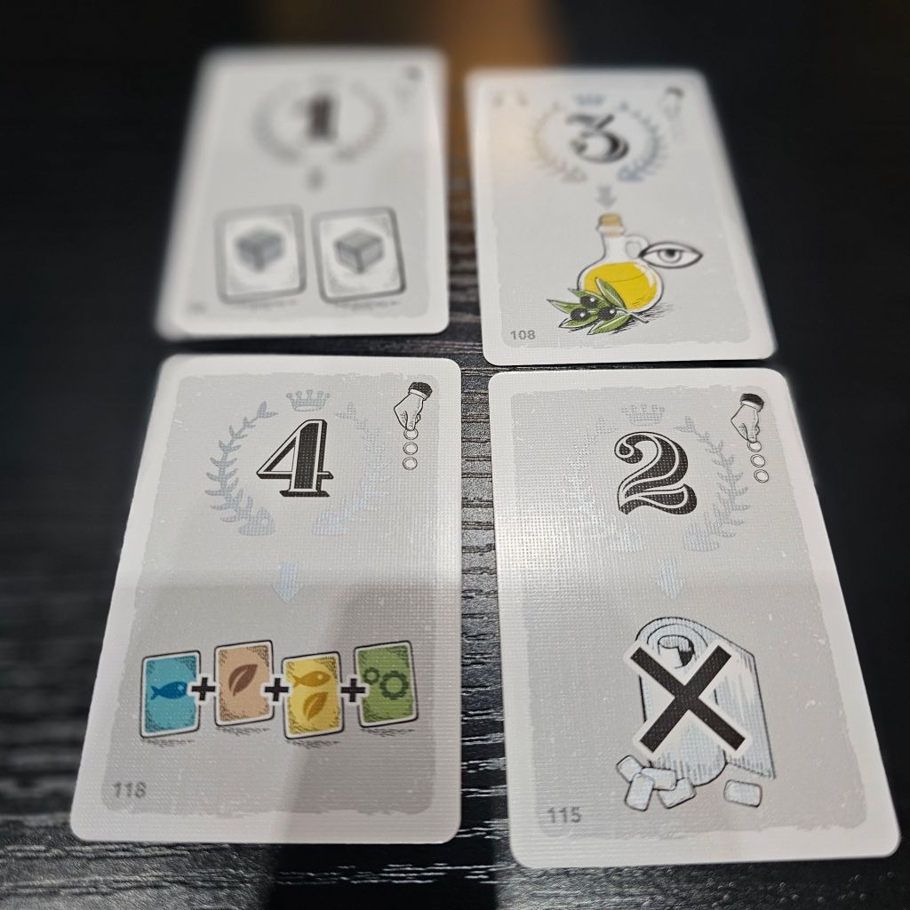 Oliva packs a punch from its small box, threading a nice line between familiar mechanisms and unique implementations. It’s a game that requires table awareness and promotes an environment where players are present at all times, at all turns, always seeing what’s next, what card each one took, what moves they are making and setting up to make. But that is not overwhelming as turns come and go blazing fast. It’s simple, but very rich.