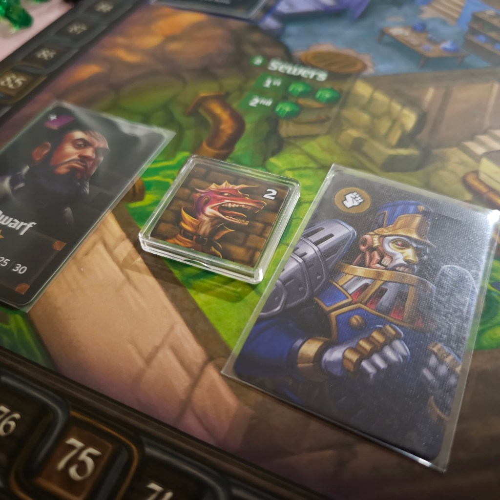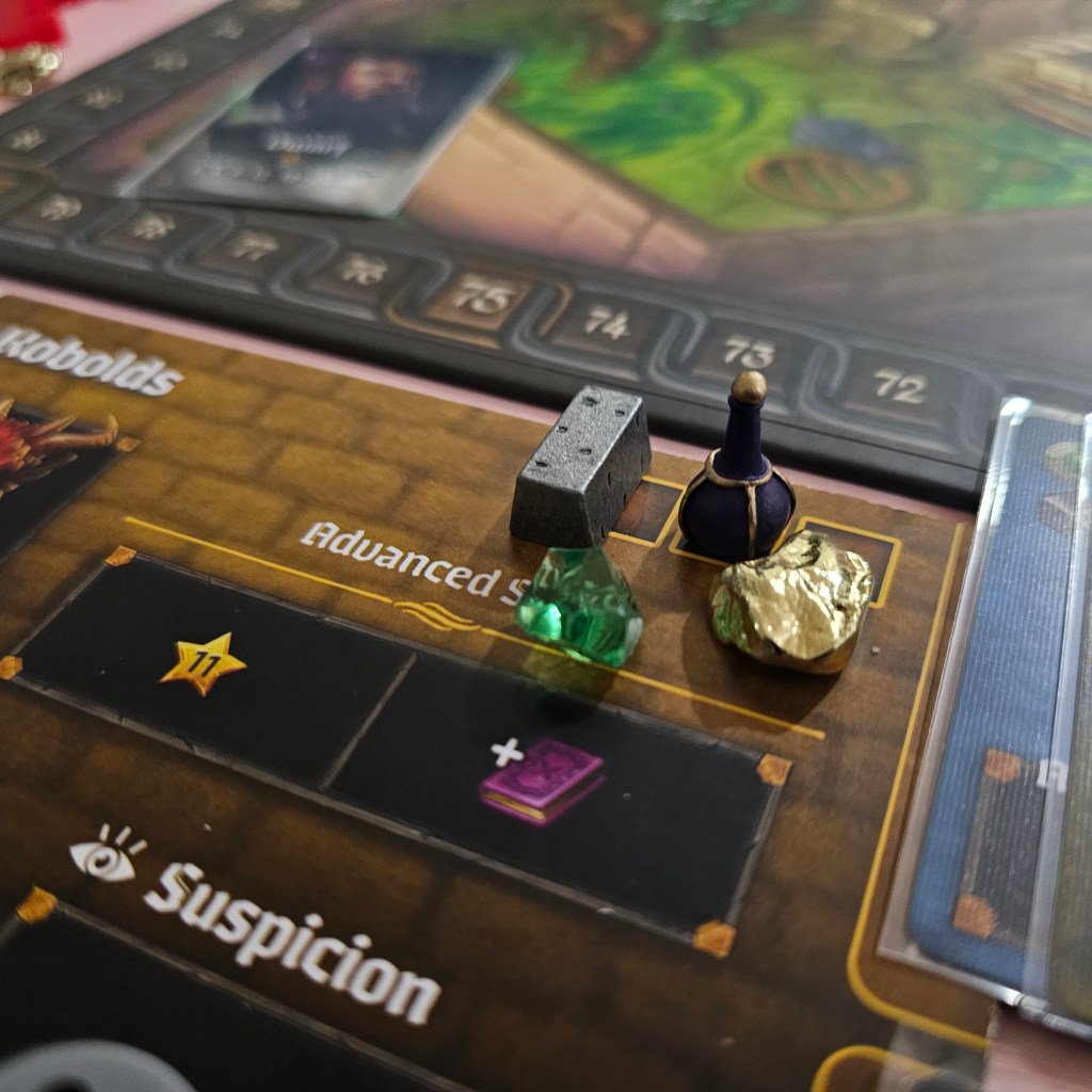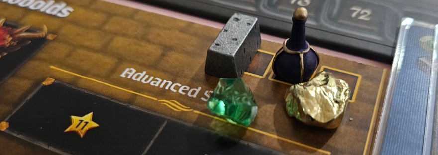 The symbology is clear and very functional. So even though I wanted custom pieces, it had to work. I found on Game Crafter good premium quality resources that not only matched the objects depicted, but the color on the icons. Iron, gold and Potions was easy, and the two metals specially are wonderful tactile addition. Scraps were harder, and it’s a bit of an abstract concept in a tough color, but I like the gems.