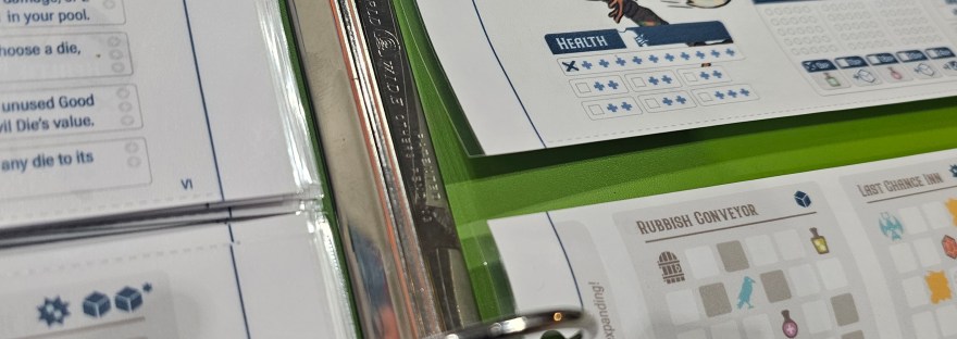 But let’s analyze those parts. The character and encounter tables are clear and easy to understand and use. I wish the spaces to mark your stuff, specially food and life, were bigger. It can get a bit messy. But it’s mostly fine.